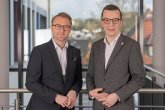 Zwei Radfahrer fahren auf einem Radweg. Sie haben blaue Jacken an und fahren an einer stillgelegten Lok vorbei.