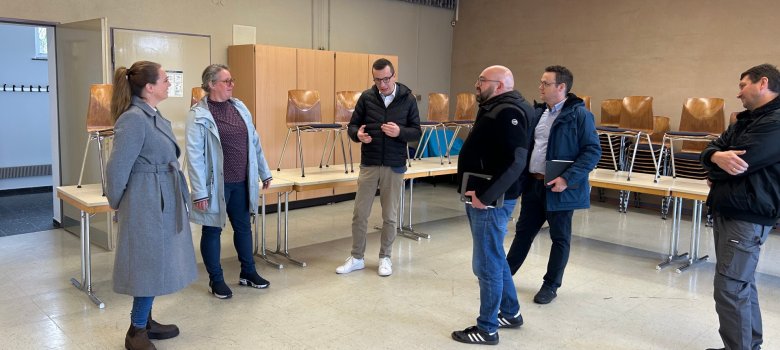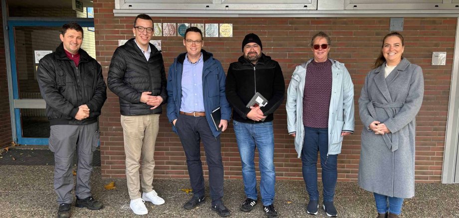 Gute und konstruktive Gespräche auf Augenhöhe: Konrektorin Anika Justus, Schulleiterin Brigitte Schepp, Erster Kreisbeigeordneter Patrick Krug, Stefan Schmidt, Leiter des Amtes für Energie, Hochbau und Gebäudewirtschaft, Matthias Röse, Leiter des Amtes für schulische Bildung und Betreuung, und Hausmeister Andreas Treiber (von links).