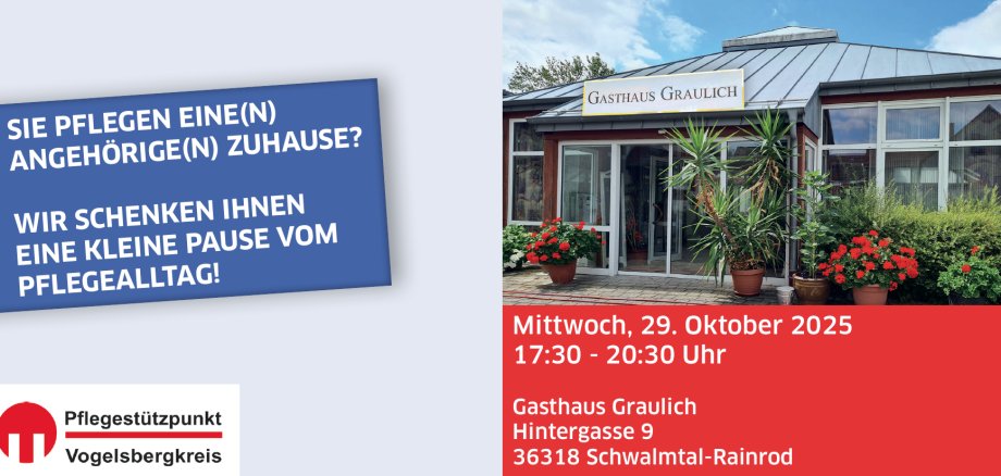 Vogelsbergkreis. Mit Gleichgesinnten ins Gespräch kommen, neue Impulse und Informationen erhalten oder einfach in gemütlicher Runde mit Musik und gutem Essen vom Alltagsstress entspannen: Die „Pause vom Pflegealltag“ des Pflegestützpunkts Vogelsbergkreis lädt pflegende Angehörige am 29. Oktober von 17.30 bis 20.30 Uhr ins Gasthaus Graulich, Hintergasse 9, Rainrod, ein.
