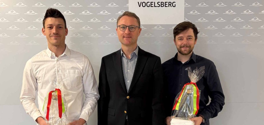 Vogelsbergkreis. „Sie können richtig stolz auf sich sein!“ Gleich zwei Mitarbeitern des Landratsamtes konnte Landrat Dr. Jens Mischak zu ihren abgeschlossenen Ausbildungen gratulieren: Constantin Croonenbrock und Jakob Christen.