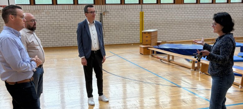 Die Turnhalle der Grundschule in Engelrod wird auch von umliegenden Vereinen genutzt, was sehr gut funktioniere, wie Schulleiterin Swetlana Daberkow dem Ersten Kreisbeigeordneten Patrick Krug (Mitte) sowie Matthias Röse, Leiter des Amtes für schulische Bildung und Betreuung, sowie Stefan Schmidt, Leiter des Amtes für Hochbau, Energie und Gebäudemanagement, (von links) schilderte.