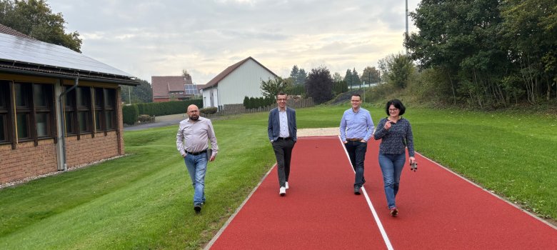 Stefan Schmidt, Leiter des Amtes für Hochbau, Energie und Gebäudemanagement, Erster Kreisbeigeordneter Patrick Krug, Matthias Röse, Leiter des Amtes für schulische Bildung und Betreuung, und Schulleiterin Swetlana Daberkow (von links) schauten sich die schuleigene Weitsprunganlage an.