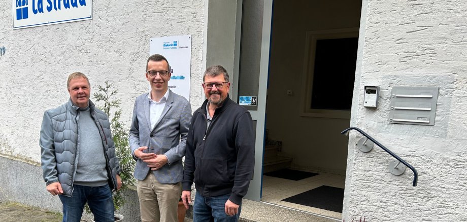 Die Wohnungsnotfallhilfe und das Übergangswohnheim, betrieben von der Regionalen Diakonie Oberhessen, arbeiten seit rund drei Dekaden auch eng mit dem Vogelsbergkreis zusammen, berichten Christoff Jung, Leitung Regionale Diakonie Oberhessen, und Andreas Wiedenhöft, Bereichsleiter Existenzsicherung und Teilhabe in der Regionalen Diakonie Oberhessen, die den Sozialdezernenten an diesem Herbstvormittag bei „La Strada“ in der Altenburger Straße begrüßen.