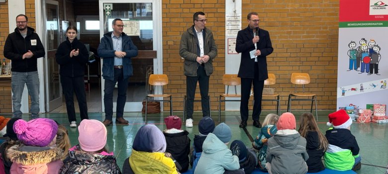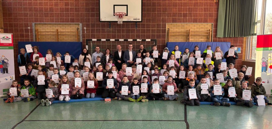 Deren 104 Schülerinnen und Schüler erreichten mit 40,36 Punkten pro Kind den höchsten Wert im Vogelsbergkreis. „Eine hervorragende Leistung, auf die ihr alle sehr stolz sein könnt“, konstatierte Landrat Dr. Jens Mischak im Rahmen einer kleinen Feierstunde in der Turnhalle der Schule. Gemeinsam mit dem Ersten Kreisbeigeordneten und Schuldezernenten Patrick Krug, Bewegungskoordinator und Projektinitiator Dominic Günther sowie dem Leiter des Amtes für schulische Bildung und Betreuung, Matthias Röse, überreichte der Landrat bewegungsfördernde Spiele als Gewinn an jede Klasse sowie für jedes Kind eine Urkunde.